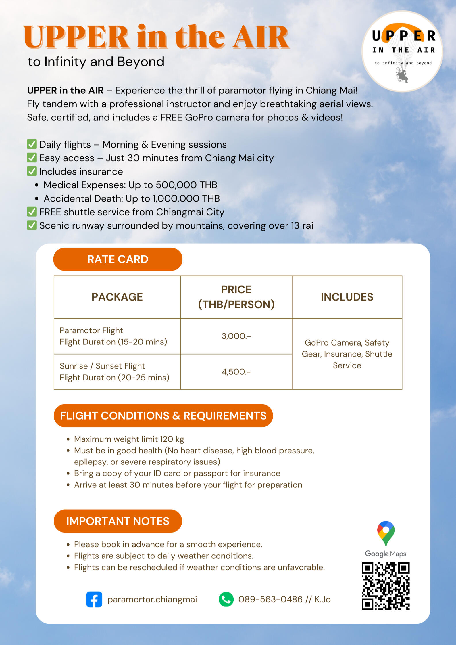 Take Flight with Chiang Mai’s Premier Paramotor Experience. Looking for an unforgettable paramotor adventure in Chiang Mai at UPPER in the AIR Paramotor School, we offer safe, certified, and breathtaking paramotor flights over stunning mountain landscapes. Whether you're a beginner or a seasoned pilot, our professional instructors ensure a thrilling yet secure flying experience.